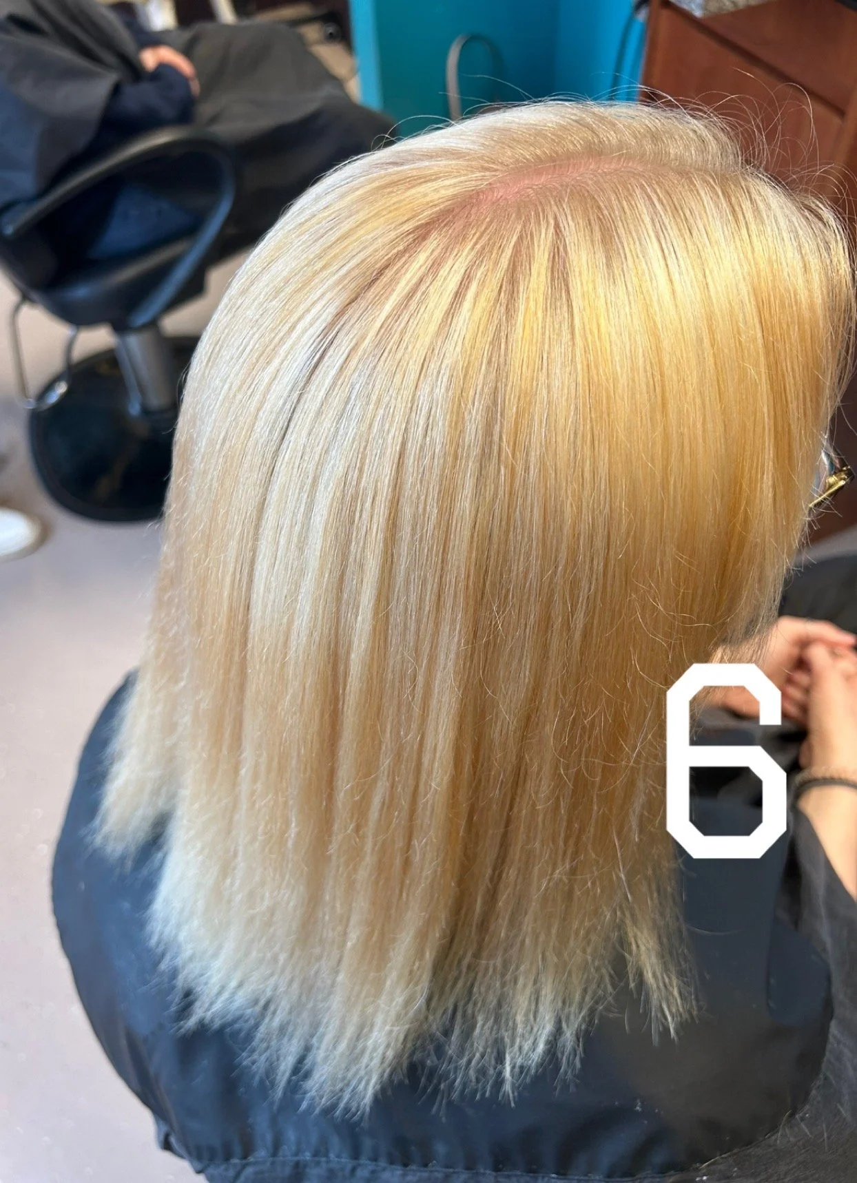 Georgia came to us with black box color on her naturally, almost-white hair. Georgia's journey back to blonde took six sessions, but with the help of our skilled stylists, she achieved her desired look without damaging her hair.
