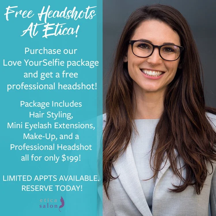 We’ve put together a Love Your Selfie package that includes, hairstyling, mini-eyelash extensions, make-up application, AND we’ve hired a photographer to take your professional headshots!